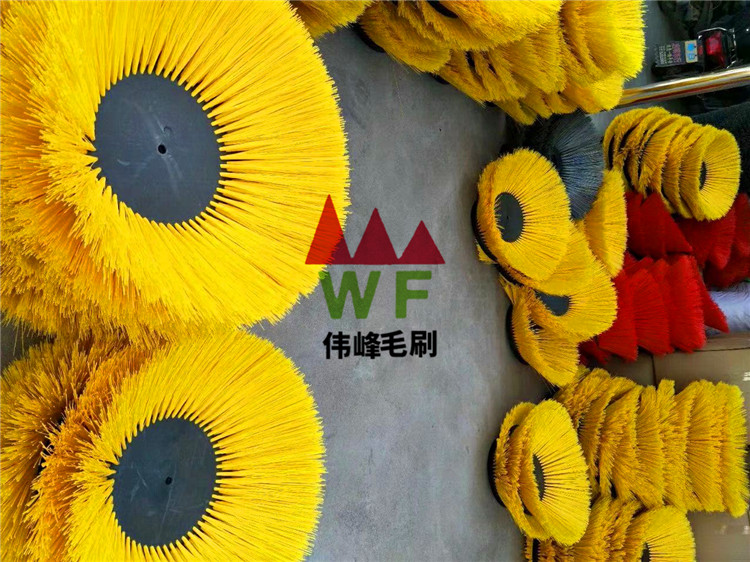 掃路刷:在切割好的PP圓盤上成一定角度(∠135°)鉆孔,再用切好的扁鋼絲或PP刷絲、尼龍絲對折后串插即可,刷子裝在市政環(huán)衛(wèi)車用于清掃街道\清掃積雪等。