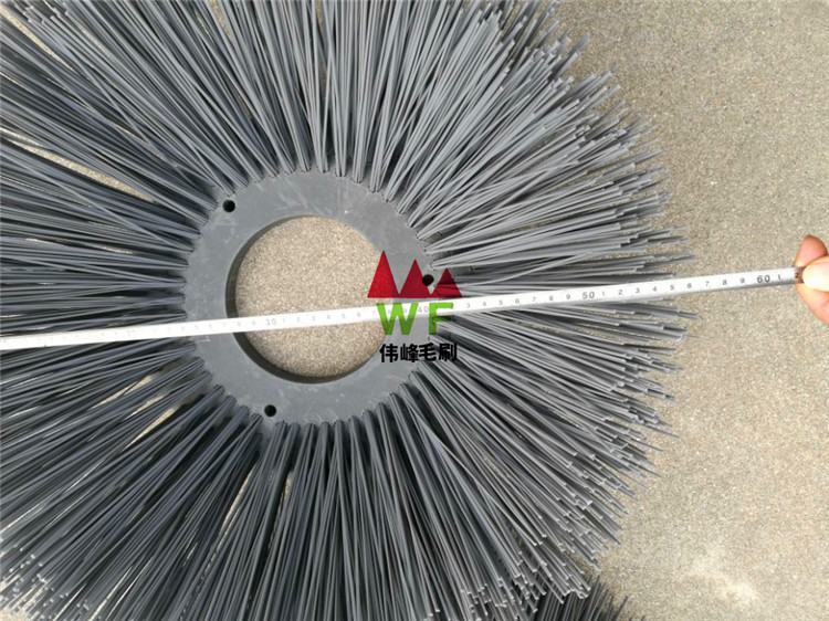 掃路刷:在切割好的PP圓盤上成一定角度(∠135°)鉆孔,再用切好的扁鋼絲或PP刷絲、尼龍絲對折后串插即可,刷子裝在市政環衛車用于清掃街道\清掃積雪等。